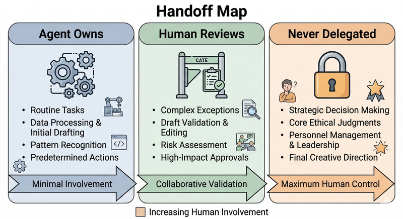 Run a Handoff Map before any agent touches a live workflow: define what the agent owns end-to-end, where a human reviews before the agent proceeds, and what never gets delegated regardless of capability. Most teams do the first step and skip the third, the non-delegables, and that's exactly where things break in ways you find out about later. Write it down, make it a team decision, and treat it as a design artifact, not a verbal agreement.