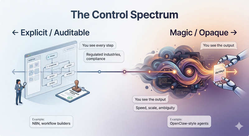 The architecture of a tool encodes a philosophy about who's in control and what they're willing to trade for it. N8N says: you stay in control, we make the logic visible. OpenClaw says: trust the agent, we'll handle the complexity. Neither is wrong. Both are right in the contexts they were built for.
